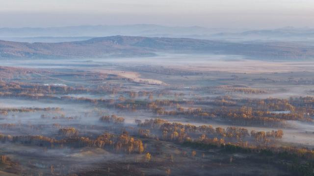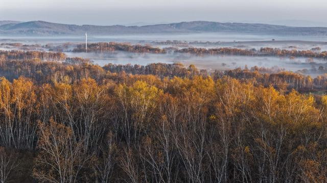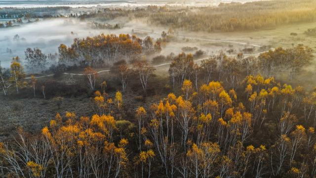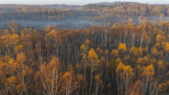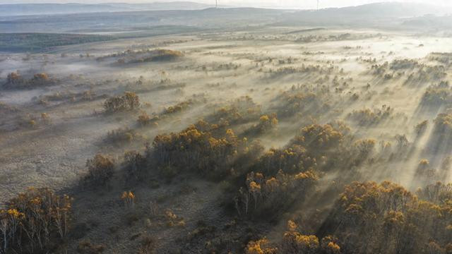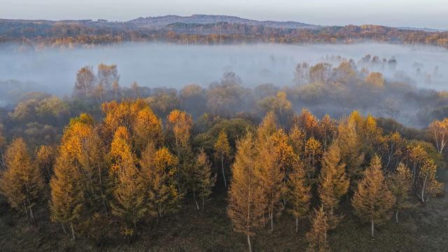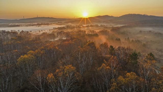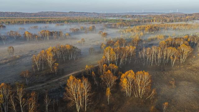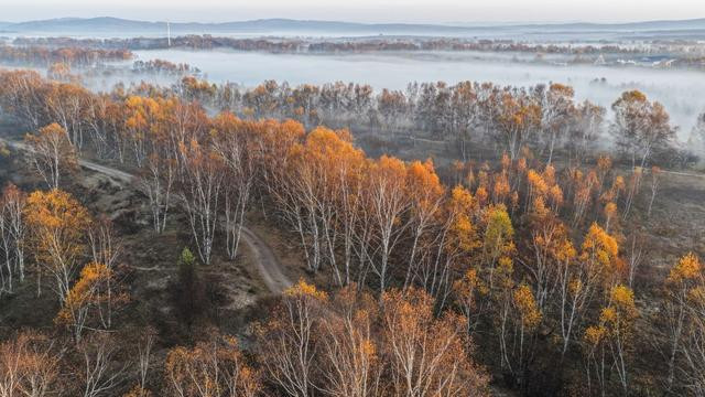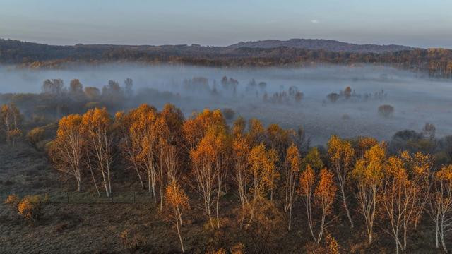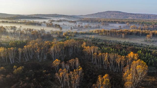 秋日清晨,河北省承德市围场满族蒙古族自治县的坝上草原层林尽染、色彩斑斓,秋景如画。