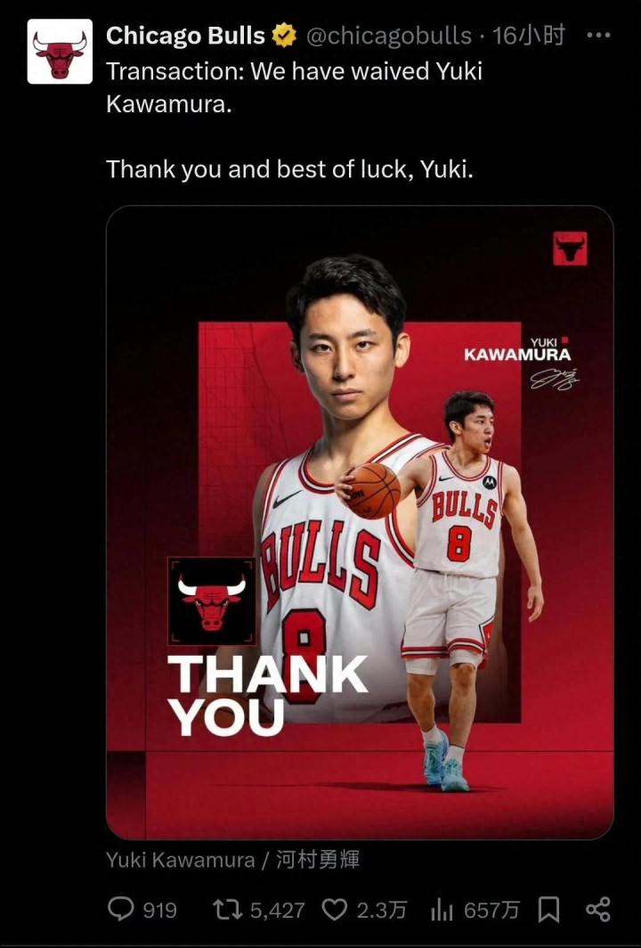 在NBA新赛季开始之前,芝加哥公牛队裁掉了球队的双向球员河村勇辉。