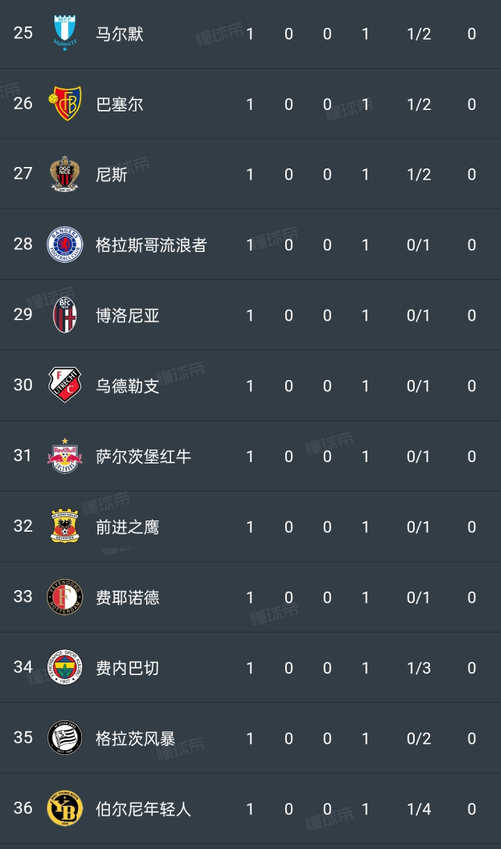 而上赛季还出现在欧冠联赛中的五支球队在欧联首轮比赛中均输掉了比赛。这五支球队分别是意甲博罗尼亚,奥地利豪门萨尔茨堡红牛,荷甲豪门费耶诺德,奥地利豪门格拉茨风暴和瑞士豪门伯尔尼年轻人。