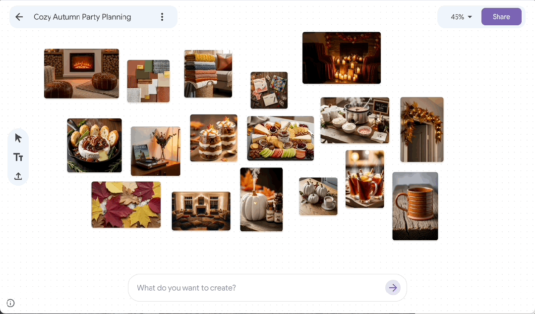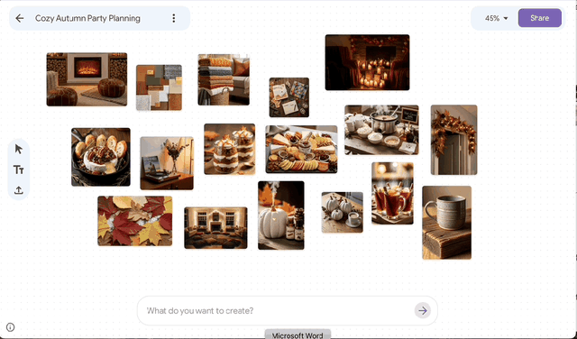 以一场秋季派对为例,画板在第一次输入提示词后会生成大约15张图片,其中包括温馨的烛光、可口的小蛋糕、暖心的饮品等,瞬间让氛围拉满。