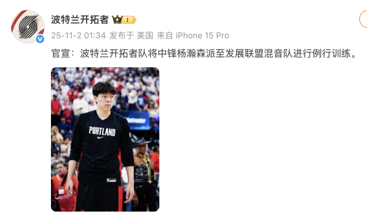 根据开拓者随队记者报道,开拓者此举是为了让杨瀚森收获更多的训练时间,并且他将在11月4日与湖人的比赛中重回球队。另外,如果杨瀚森之后在开拓者获得的上场机会不多,他将频繁往返于开拓者和混音队。